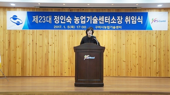 생활지도사 출신으로 구미시농업기술센터 최초의 여성 소장으로 취임한 정인숙 소장은 “직원과 농업인과의 대화를 통해 소통과 화합에 중점을 두고 현장감 있는 연구와 지도사업을 펼치겠다.”며, “상담소의 기능을 강화하고 농업기술센터 고유업무에 치중하여 농업기술센터만이 할 수 있는 일을 찾아 하겠다.”고 말했다.