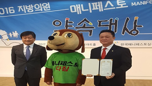 한국매니페스토 실천본부에 따르면 ‘매니페스토 약속대상’은 공약을 가장 잘 이행한 정치인들에게 주는 상으로 전국 234개 기초자치단체의 2,900여명의 의원들을 대상으로 공약이행 현황(70점)과 주민소통 활동(30점)을 평가지표로 심사해 기초의원 공약이행 분야 최우수의원으로 선정했다고 밝혔다.