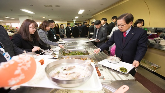 구미시는 AI 확산에 따른 양계농가를 돕기위해 1월 18일 삼계탕 Day로 정하고 구내식당에서 닭고기를 함께 먹는 행사를 마련했다. 이 날 남유진 구미시장, 이경문 노조위원장, 김중권 부시장과 간부 및 신규직원 400여명이 닭 소비촉진에 앞장섰다. |
