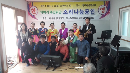 농협구미시지부(지부장 이기욱)는 지난 1월 14일 고아읍 외예리 봉사활동에 이어 21일 무을면 오가리 마을 주민 50여명과 이 마을 명예이장 ㈜드림팩 박대금 대표 및 직원과 함께 문화공연을 개최했다. 이날 소리나눔예술봉사단(단장 김병환)의 공연후원으로 약 20여명의 단원이 우리민요와 색소폰 연주, 마술공연 및 지역가수 등이 참여해 주민들과 흥겨운 시간을 보냈다.