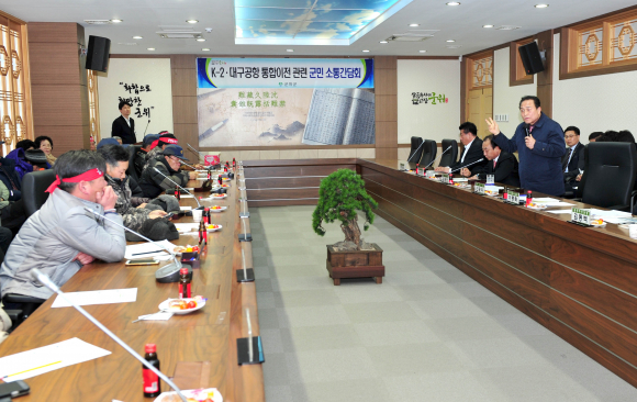 군위군은 1월 25일 군청 제2회의실에서 통합이전 관련 주민소통 간담회를 개최했다. 이 날 간담회에는 최근 대구공항 통합이전 예비후보지로 거론되고 있는 우보면 주민 25여명과, 김영만 군수, 김영호 군의회 의장, 박창석 부의장 등 관계자 10여명 등 35여명이 참석했다.