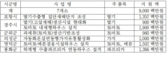 올해는 원예·특용작물 도비 공모사업으로 포항시 딸기 수출형 집단재배단지 조성, 봉화군 하계형 수출파프리카 연동하우스 설치지원 등 6개 시·군에 90억 원을 투자할 계획이다.