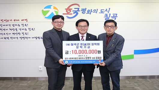 성유 사회복지법인(대표 장병무·원장 장재경)은 지난 2월 2일 칠곡군 지역인재육성과 교육발전을 위해 써달라며 (재)칠곡군호이장학회(이사장 백선기)에 호이장학금 1,000만원을 기탁했다. |