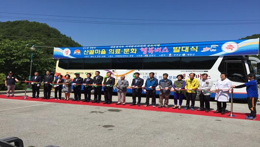 경북 김천시에서 출발한 의료버스가 충북 영동군과 전북 무주군의 산골마을에서 지역민의 건강을 검진하고 있다. 3개 시도의 접경지역이라 의료와 문화의 사각지대였지만 이제 정기적인 건강 검진과 영화 관람 등 문화생활을 누릴 수 있게 됐다.