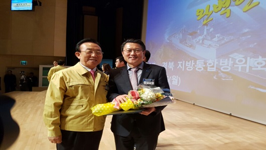 정시몬 칠곡군지회장(우) | 한국자유총연맹 칠곡군지회는 지난 2월 6일 ’2017 대구·경북 지방통합방위회의’에서 정시몬 지회장이 최우수 개인표창을 수상했다고 밝혔다. 이날 회의는 김관용 도지사와 권영진 대구시장을 비롯한 시장·군수·구청장, 시·군·구의회 의장, 군·경 주요 지휘관, 통합방위협의회 위원 등 680여 명이 참석한 가운데 경북도청 동락관에서 개최됐다.