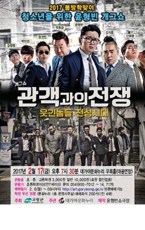 고령군은 봄 방학을 맞아 대가야문화누리 우륵홀(대공연장)에서 지역 학생들에게 종합선물세트와 같은 풍족한 개그 공연을 보여줄 윤형빈 개그쇼‘관객과의 전쟁 – 웃긴 놈들의 전성시대’공연을 준비한다. 입장료는 초·중·고등학생 3,000원, 일반 10,000원에 문화누리 홈페이지 및 현장에서 예매중이며 공연 일시는 다가오는 2월 17일 19:30이다.