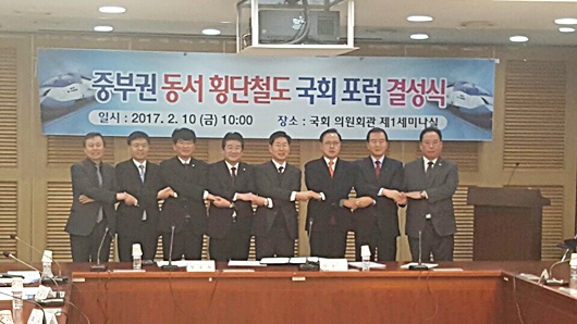 중부권 동서 횡단철도의 국가계획반영을 위한 노선통과 12개 시군 국회의원들이 여의도 국회회관에서 포럼 결성식을 갖고 본 노선 건설에 대한 토론과 함께 공동건의문을 채택하고 대선공약화를 위해 소속 정당을 떠나 함께 손을 맞잡았다.