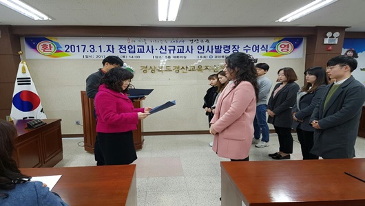 경산교육지원청은 2월 16일 경산교육지원청 강당에서 전입교사 인사발령통지서와 3월 1일자 신규 임용교사임명장 수여식을 실시했다.