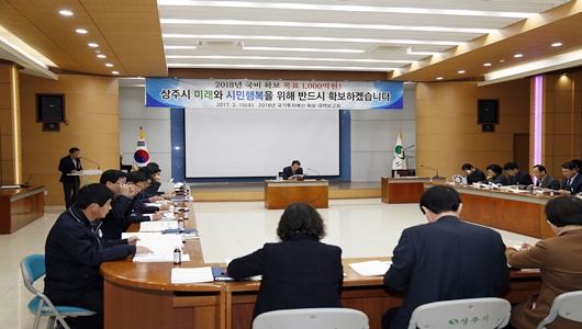 상주시는 2월 15일 시청 대회의실에서 간부공무원 및 실과소장이 참석한 가운데 시장 주재로 ‘2018년 국가투자예산 확보 대책 보고회’를 개최했다. 부서별로 발굴한 2018년 국비보조사업을 중심으로 국비확보 1,000억원을 목표로 설정하고 2월부터 경상북도를 비롯한 중앙부처 관련부서를 방문해 사업의 당위성과 필요성을 적극적으로 설명해 나갈 계획이다.
