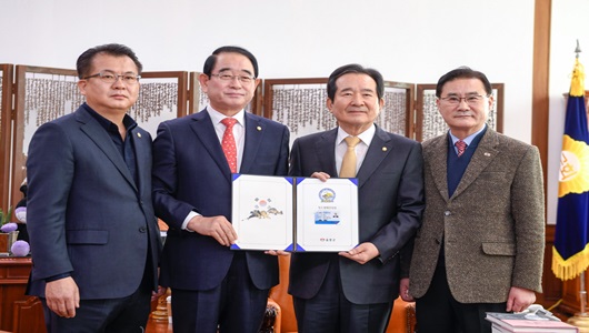 (왼쪽부터) 정성환 울릉군의회 의장, 박명재 국회의원, 정세균 국회의장, 최수일 울릉군수 |