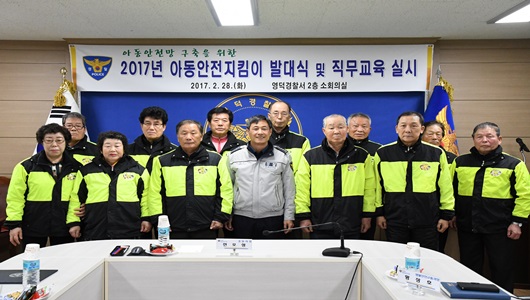 영덕경찰서는 2월 28일 경찰서 2층 회의실에서 전오성 경찰서장, 생활안전교통과장, 관내 파출소장, 아동안전지킴이(12명)이 참석한 가운데 ‘2017년 아동안전지킴이 발대식 및 직무교육’을 실시했다.