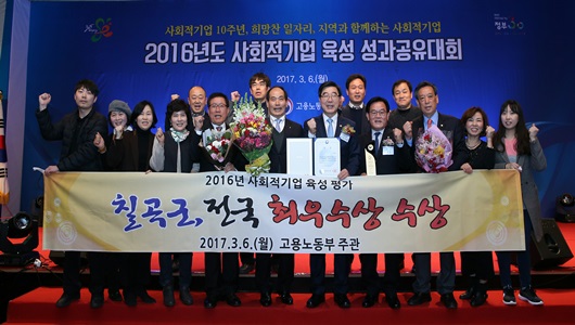 칠곡군은 지난 3월 6일 서울시 영등포구 중소기업 중앙회에서 개최된 ‘2016년 사회적 기업 육성 우수기관 평가’ 에서 최우수상을 수상했다. 2016년 사회적 기업 육성 우수기관 평가는 사회적 기업 발전에 공헌한 자치단체의 노력과 사업성과를 공유해 앞으로 사회적 기업 성장 동력과 활성화 기반을 구축하고 취약계층 일자리창출을 늘리고자 마련됐다.