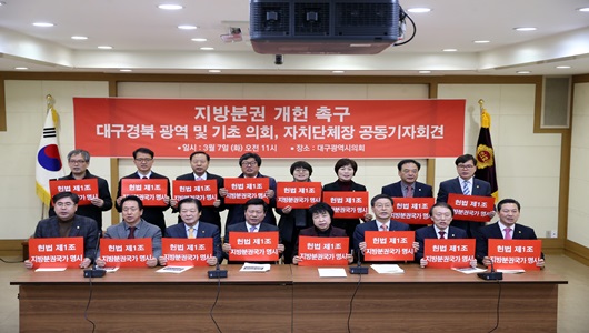 경상북도의회, 대구광역시의회, 대구구청장군수협의회, 경북시장군수협의회, 대구구군의회의장협의회, 경북시군의회의장협의회, 지방분권운동대구경북본부 7개 민관 기관단체는 3월 7일 대구광역시의회에서 헌법 제1조 지방분권국가 명시, 지역대표형 상원제 도입을 내용으로 하는 지방분권 개헌 촉구 기자회견을 가졌다.