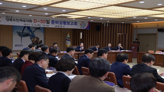 영천시는 지난 3월 9일 시청 대회의실에서 시청 간부공무원, 각 부서장과 유관기관·단체의 담당 과장 등 80여명이 참석한 가운데 제55회 경북도민체육대회 D-50일 준비상황보고회를 가졌다.