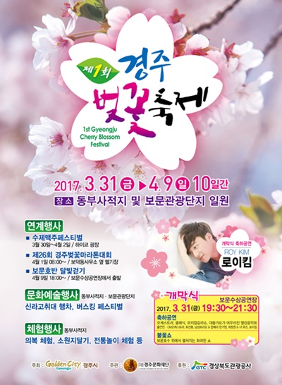 (재)경주문화재단이 주관하고 경북관광공사가 후원하는 이번 축제는 경주의 대표적인 관광자원인 벚꽃을 소재로 젊은 층과 가족단위 관광객이 즐길 수 있는 다양한 문화예술 공연과 관광콘텐츠를 선보일 예정이다.
