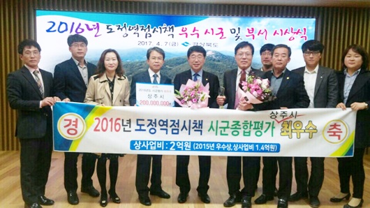 2015년 평가에선 도내 2위(상사업비 1.4억원)로 선정된 바 있으며, 2016년도에는 정부합동평가 결과와 도 역점사업인 일자리창출, 서민생활 안정 및 FTA대응 농업경쟁력강화 등 시정의 10개 부문 165개 세부지표로 추진되어 상주가 전 분야에 최고 실적으로 최우수 시·군에 최종 확정됐다.