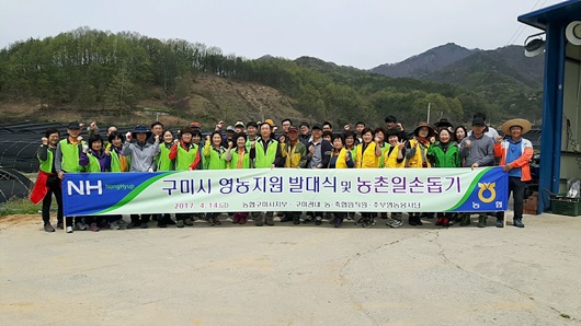 농협구미시지부는 본격적인 영농철을 맞아 농업인 고령화와 농촌인구의 감소에 따라 영농에 많은 어려움을 겪고 있는 농업인들을 지원 하기 위해 4월 14일 ‘범 농협 전국동시 영농지원 발대식 및 농촌일손돕기’를 실시했다.