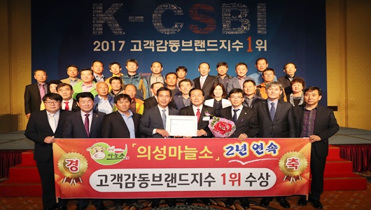 의성군은 (사)한국브랜드경영인협회에서 주관하고 산업통상부가 후원하는 ‘2017년 고객감동브랜드지수’ 지역특산물 한우부문에서 마늘소가 작년에 이어 2년 연속 1위로 선정돼 최고의 상을 수상하는 영광을 차지했다.