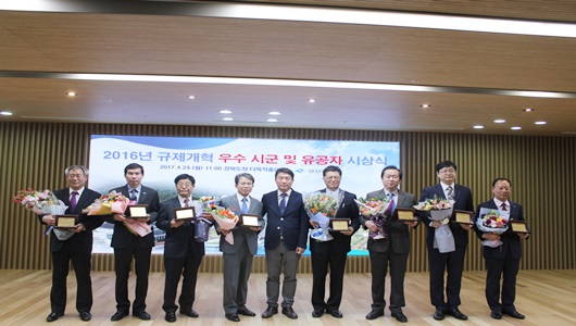 경상북도는 4월 24일 도청 다목적 홀에서 기업 투자 활성화와 국민 생활불편 해소에 적극적으로 기여한 우수 시·군 및 유공자를 표창하는 ‘2016년 규제개혁 추진실적 평가’시상식을 가졌다. 이번 시상식에서는 ▲ 대상 상주시·의성군, ▲ 최우수상 구미시·영덕군, ▲ 우수상 영천시·봉화군, ▲ 장려상 포항시·예천군이 수상했다.