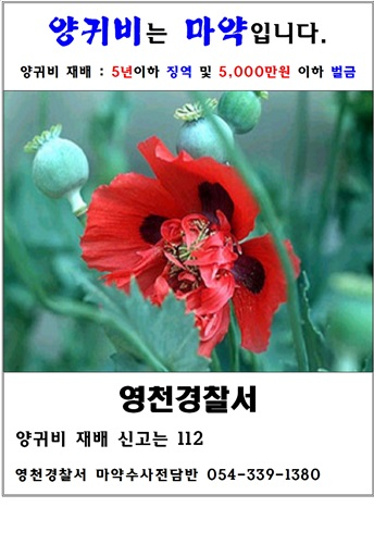 앞으로도 영천경찰서는 양귀비와 대마 공급을 원천 차단하기 위해 4월 1일 ~ 7월 31일까지 특별단속기간으로 지정해 개화기 및 수확기 집중단속을 이어갈 방침이다. |
