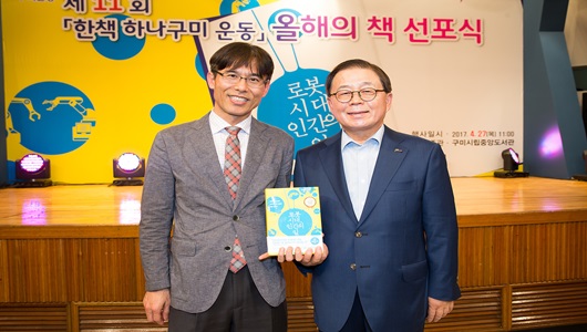 구미시는 4월 27일 구미시립중앙도서관 강당에서 독서회원, 시민, 학생 등 450여명이 모인 가운데 제11회 ‘한책 하나구미 운동’ 올해의 책 선포식을 개최했다. 이날 행사는 아트락티브 앙상블 팀의 현악3중주 식전 공연을 시작으로 올해의 책 선정 경과보고, 인사말 및 축사, 작가와의 만남, 올해의 책 선포 등의 순으로 진행됐다. 올해의 책으로 선정된 구본권 작가의 ‘로봇시대, 인간의 일’은 모든 것이 자동화되고 로봇이 인간의 일을 대체하는 미래시대의 거대한 변화에 직면해 있는 우리가 무엇을 알아야 하고, 어떻게 대처해야 하는지 다양한 측면에서 화두를 던지고 독자 스스로 답을 찾도록 유도한다.