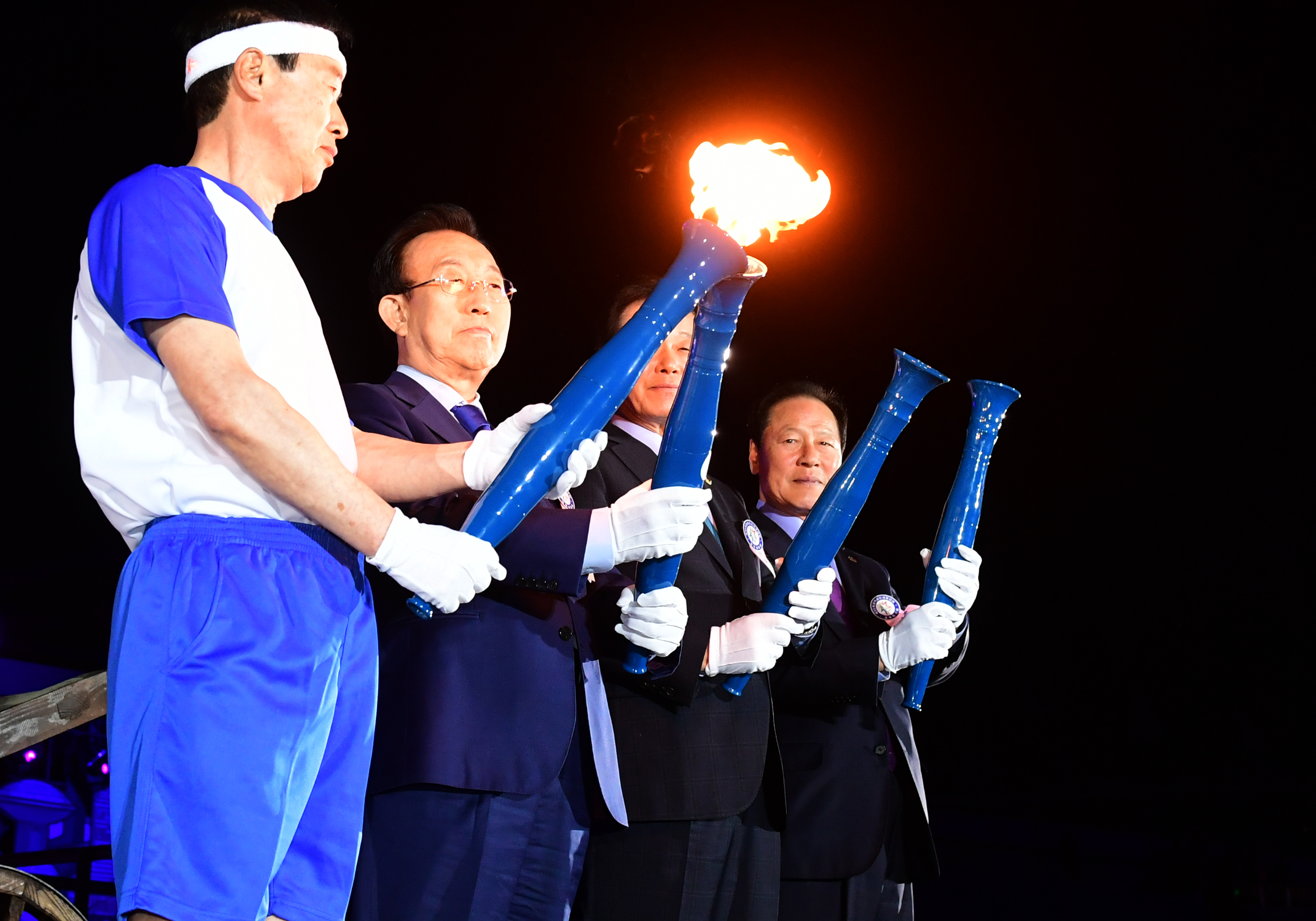 이어 공식행사의 피날레인 성화점화는 어느때보다 색다른 연출이 돋보였다. 성화는 지난 4월 27일 경북의 숨결을 간직한 경주의 토함산과 영천의 보현산에서 채화돼 영천시청 광장에서 불꽃을 피웠으며, 이날 성화봉송 마지막 주자가 신기전에 불을 붙여 에어로켓이 발사돼 점화되는 마치 최무선 장군의 신기전을 연상케 했다. 특히 성화점화에 김관용 도지사와 김응규 도의회의장, 김영석 영천시장, 그리고 마지막 주자인 송재열 영천상의회장이 함께 하면서 1만여명의 선수단과 2만여명의 관중 모두 하나가 되어 붉게 타오르는 ‘제55회 경북도민체전’의 성화 불꽃을 쏘아 올리며, 강인한 경북인의 자부심과 도민 화합의 염원을 담았다.