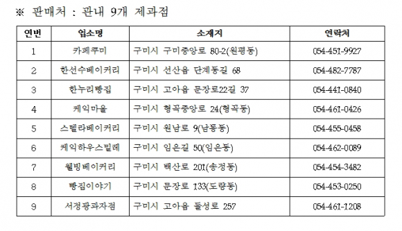 구미시가 관광 상품화를 위해 제과협회 구미시지부와 공동 개발한 구미 빵 ‘베이쿠미’를 5월 1일부터 판매한다. 이번에 출시한 빵은 멜론 앙금과 팥·호두를 소로 사용한 2종으로, 겉은 바삭하고 속은 부드러운 식감을 지니고 있으며, 특히 멜론 앙금을 소로 사용한 빵은 진한 향이 특징이다.
