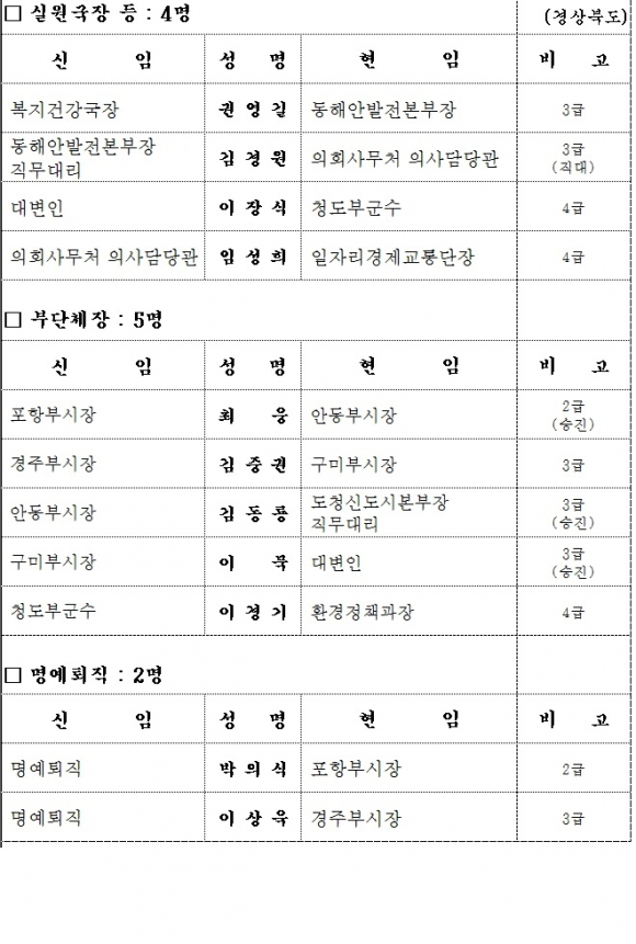 경상북도는 복지건강국장, 포항·경주시 부단체장이 명예퇴직 함에 따라 소폭의 실·국장 및 부단체장 총 11명에 대한 전보인사를 5월 2일자로 시행했다.