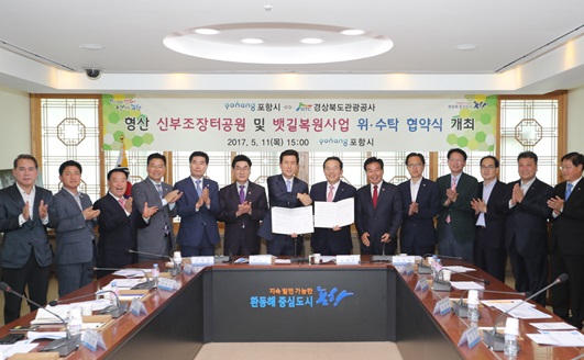 포항시가 지역주민의 염원을 담은 ‘형산 신부조장터공원 및 뱃길복원사업’을 본격 추진한다. 이와 관련해 시는 5월 11일 시청 중회의실에서 이강덕 시장과 김대유 경상북도관광공사 사장, 시·도의원 등 40여명이 참석한 가운데 형산 신부조장터공원 및 뱃길복원사업 위·수탁 협약식을 경상북도관광공사와 체결했다.
