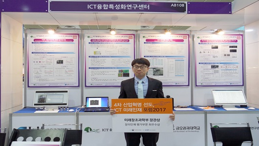 금오공과대학교 ICT융합특성화연구센터 이필호(32세·지도교수 장영찬) 연구원이 지난 5월 24일 서울 코엑스에서 열린 ‘ICT 미래인재포럼 2017’에서 미래창조부 장관상(최우수상)을 수상했다. 미래인재포럼은 미래창조과학부가 주최하고 정보통신기술진흥센터(IITP), 대학정보통신연구센터협의회(ITRC) 등이 주관하고 있다. 금오공대 전자공학과 박사과정에 있는 이필호 연구원은 최근 3년 동안 SCI(E)급 논문 3편과 특허 2건을 비롯해 4건의 기술이전에 주도적 역할을 수행하는 등 우수한 실적을 거뒀다. 4건의 기술 이전은 산업체 양산에 적용되며, 관련 기술 또한 IEEE 논문에 게재 추진 중이다. 또한 국제 저명 학회인 IEEE(국제전기전자기술자협회)와 ISCAS(회로 및 시스템 국제학술대회)에서 관련 논문도 발표할 예정이다. 이필호 연구원은 “ICT융합특성화연구센터에서의 연구 활동이 SCI 논문 게재 및 기술 이전에 큰 도움이 됐다.”며 “앞으로도 관련 분야 연구의 지속적 수행을 통해 민·군융복합연구에 기여할 수 있도록 노력하겠다.”고 밝혔다.