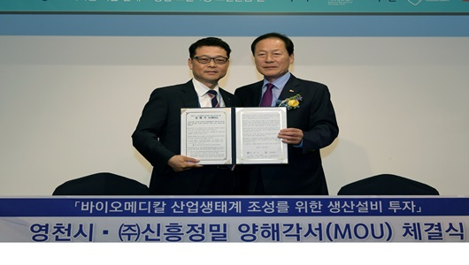 영천시는 지난 5월 31일 쉐라톤 서울 팔래스 강남 호텔에서 열린 ‘2017 비전자의료기기 산업생태계 포럼’ 행사에서 사출의료기기제품 생산을 위해 영천지사(부설연구소)를 설립한 ㈜신흥정밀과 생산기술 확보와 상용화를 위한 생산설비 투자 양해각서(MOU)를 체결했다.
