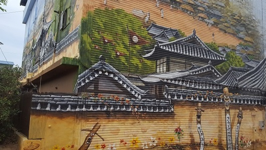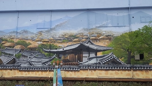 군위군은 지난 5월 8일 ~ 29일까지 군위읍 서부리 사라온이야기마을 앞 현대내과 건물 벽면에 용역비 2천만 원을 들여 전통마을 모양의 벽화작업을 준공했다.