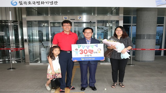 30만 번째 입장의 행운은 조창열씨(구미시 황상동)가족으로, “7살 딸 은서가 유치원에서 다녀간 뒤 기념관을 다시 가고 싶다고 해서 방문했는데 이런 축하를 받게 되어 매우 기쁘고 뜻깊다.”며 “우리 딸이 전쟁의 교훈을 되새길 수 있는 성인으로 자랄 수 있도록 자주 방문 하겠다.”고 말했다.