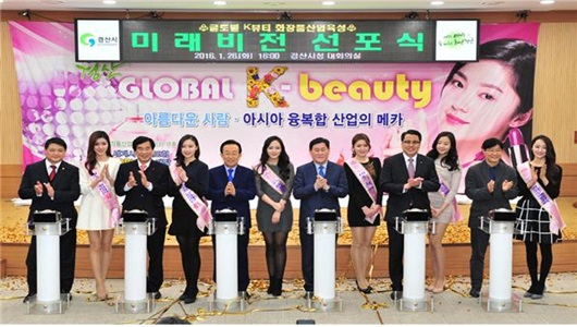 글로벌 K뷰티 화장품산업 육성 미래 비전 선포식 (16.1.26.) | 기업의 제품 기획에서 시제품 생산, 수출지원까지 원스톱으로 지원하는 ‘글로벌코스메틱비지니스센터’는 올해 3월 착공하여 내년 7월 준공을 목표로 순조롭게 진행되고 있으며, 또한 국내 최대의 화장품 수출전진기지인 ‘화장품 특화단지’는 오는 7월 착공할 예정이며 현재 입주를 희망하는 기업이 50여개에 달하고 있어 시에서는 2단계 화장품 특화단지 조성을 준비하고 있다. 앞으로 경산시는 이를 기반으로 하여 안광학, 섬유, 주얼리, 이·미용기기 등과 소재산업·ICT산업을 융합한 패션테크 융복합 산업으로 발전시켜 美-뷰티 융복합산업의 메가로 도약해 나갈 계획이다.
