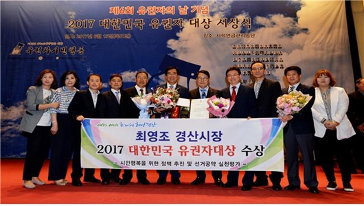 공약실천과 시민행복정책 추진에 혼신의 힘을 쏟은 결과, 지난 6월 15일 전국시민사회연합 등 290여개 단체로 이루어진 ‘유권자시민행동’이 주최한 제6회 유권자의 날 기념식에서 최영조 경산시장이 영예의 대상을 수상했다.