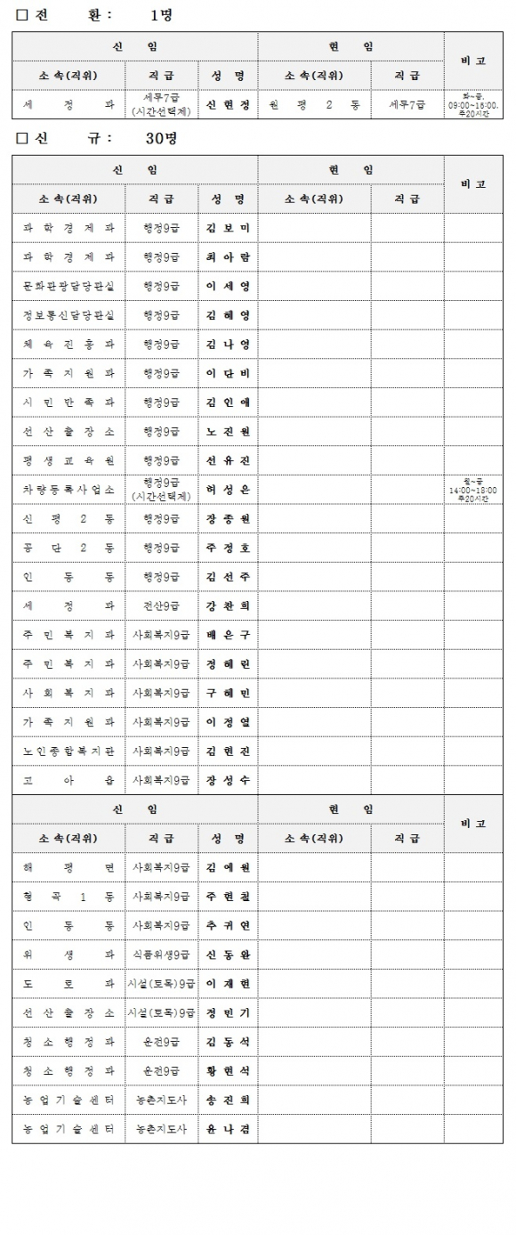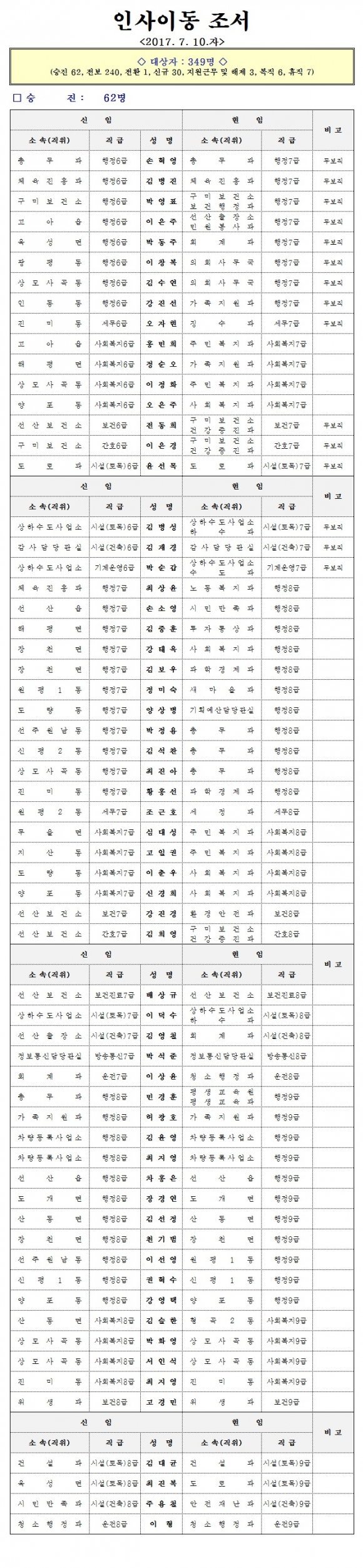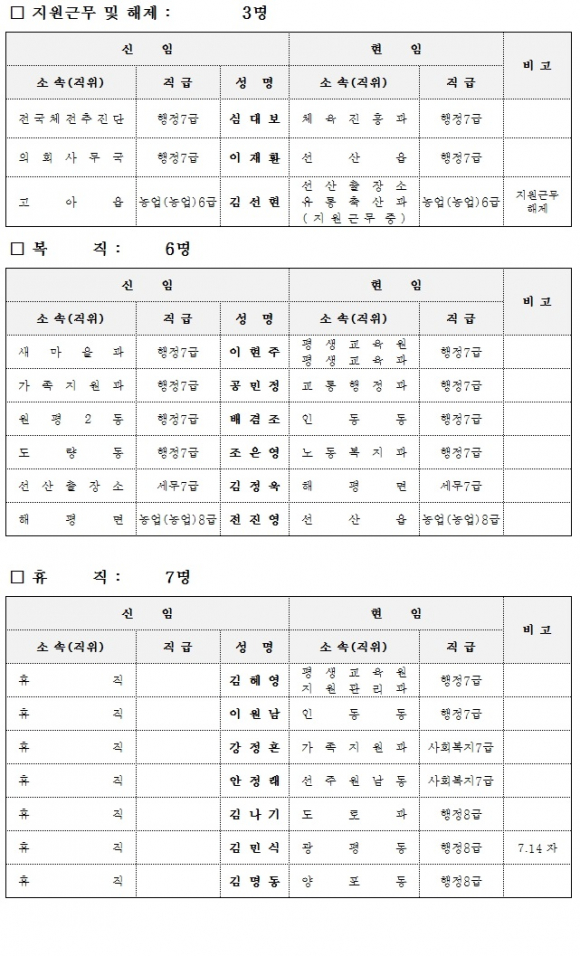 구미시 7월 10일자 인사이동조서 발표