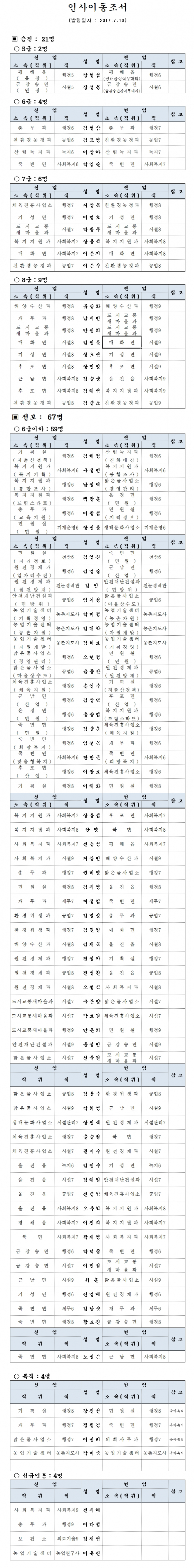 울진군은 7월 10일자 인사이동조서를 아래와 같이 발표했다.