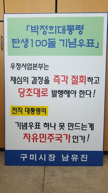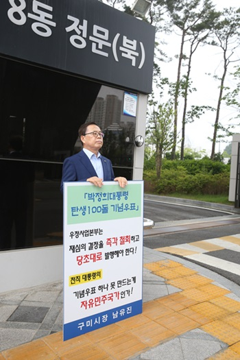 남유진 구미시장은 7월 12일 정부세종청사 우정사업본부 앞에서 ‘박정희 대통령 탄생100돌 기념우표’ 발행 재심의 결정을 철회하고 당초대로 발행할 것을 촉구하는 1인 피켓시위를 펼치고, 우정사업본부장에게 성명서를 전달했다.