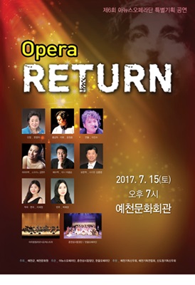 예천군은 오는 7월 15일 저녁7시부터 70여 분간 문화회관에서 무더운 여름밤 군민들의 문화향유를 위한 창작 오페라 RETURN을 공연한다고 밝혔다. 이번 공연은 예천군이 주최하고 예천아뉴스오페라단이 주관하며, 소프라노 김현주, 테너 이광순, 바리톤 강종영, 아리랑 필하모닉 오케스트라 등이 출연해 관객들에게 오페라의 아름다운 음악과 환상의 하모니를 보여줄 예정이다.