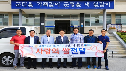 울진로타리클럽은 7월17일 지역의 어려운 이웃을 위해 써달라며 사랑의 쌀 80포(350만원 상당)를 군청 복지지원과로 기탁해 왔다. 이 날 기탁한 쌀은 제29대 울진로타리클럽 회장 이·취임식을 맞아 축하화환 대신 받은 것으로, 읍·면에서 추천한 저소득가구 80명에게 각 1포씩 전달될 예정이다.