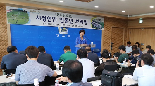 경주시 문화관광실은 7월 27일 시청 브리핑실에서 하반기 주요 현안사업에 대해 언론브리핑을 가졌다. 시는 올해 시가 추진하는 주요사업을 언론 브리핑을 통해 상호 토론하고 질의답변하는 과정을 통해 언론의 궁금증을 해소하고 부족하고 개선할 점에 대해서는 깊이 있는 논의 과정을 거쳐 사업추진 과정을 시민에게 정확히 전달함으로써 소통과 열린행정을 실현하는데 중점을 두고 있다.