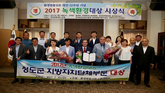 청도군은 지난 7월 19일 환경법률신문사와 환경방송이 주최하는 ‘2017년 녹색환경대상’ 시상식에서 지방자치단체부문 ‘대상’을 수상했다. 이 상은 전국 지방자체단체를 대상으로 환경보호, 생태하천복원사업, 환경기초시설설치, 민간 활동부문 등을 종합적으로 평가해 주는 상으로 지방자치단체의 환경관리 상태의 중요한 척도로 평가 된다.