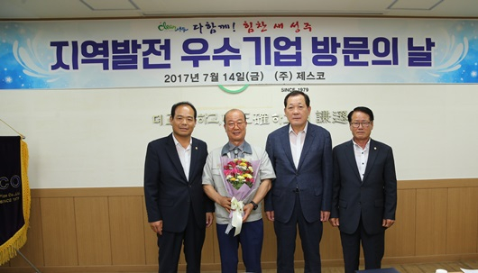성주군은 7월 14일 2017년 2/4분기 지역발전 기여 우수기업으로 ㈜제스코를 선정하고, 기업체를 직접 방문해 축하하는 자리를 가졌다. 이번 지역발전 우수기업으로 선정된 ㈜제스코는 1979년 4월 ㈜현대철강상사로 시작, 1999년 2월 현재 상호인 ㈜제스코로 상호를 변경, 기계 및 자동차용 소구경 강관을 생산하는 업체로 지난해에는 연매출액 200억 원을 달성했으며, 업체 대표인 이기원 회장은 지역 소외계층을 위해 꾸준히 봉사하는 등 지역발전에 적극적인 도움을 주고 있다.