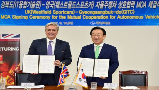 경상북도는 영국정부와 자율주행의 주요 기술인 차량개발, 고정밀 지도, 안전관리 등 광범위한 분야의 노하우를 공유하기로 합의했다고 밝혔다. 지난 8월 10일 도청 회의실에서 영국 국제통상부 마크 가니어 차관이 참석한 가운데경북도(경북IT융합기술원)-영국정부(웨스트필드 스포츠카) 간의 ‘자율주행차 상호협력을 위한 합의각서(MOA)’를 체결했다고 밝혔다.