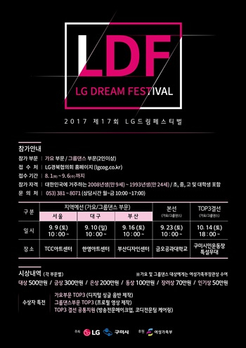 꿈과 열정의 축제인 제 17회 LG드림페스티벌이 지역예선을 시작으로 본격적인 막을 올린다. LG경북협의회(회장 LG전자 이충호 부사장)와 구미시(시장 남유진)가 주최하는 ‘제 17회 LG드림페스티벌’은 LG가 청소년의 꿈과 열정을 후원하고, 지역사회 친화활동의 일환으로 매년 개최하고 있다.