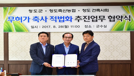 [청도=경북IT뉴스] 청도군이 관내 무허가 축사 해결에 발벗고 나섰다. 8월 28일 군수실에서 청도축협(조합장 김창태), 청도지역건축사회(회장 정경호)와 무허가 축사 적법화 지원을 위한 업무협약을 체결했다.