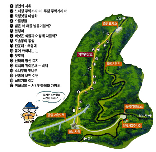 역사의 애환을 간직하며 2천년 가까운 세월, 영남 내륙을 이어온 죽령의 옛 자취를 되살려 보존하려는 뜻에서 1999년 영주시가 희방사역에서 죽령주막까지 1시간 정도(2.5km)걸리는 길을 복원했다. 울창한 숲의 나무과 산새, 다람쥐 등이 반기는 산길을 걸으며 선인들의 발자취를 느껴볼 수 있다.