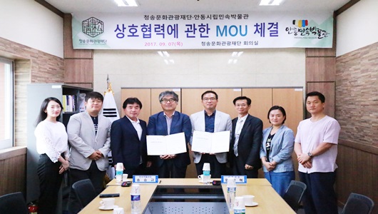 [청송=경북IT뉴스] (재)청송문화관광재단(이사장 한동수)이 안동시립민속박물관(관장 송승규)과 지난 9월 7일 청송문화관광재단 회의실에서 지역 전통문화유산의 계승발전과 가치를 공유하고 홍보하기 위해 상호 업무협약(MOU)을 체결했다.