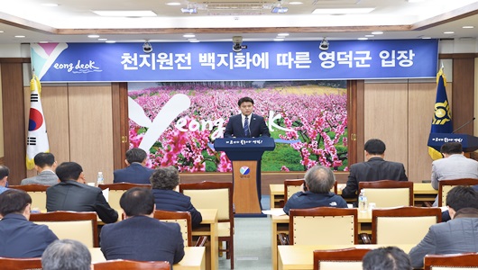 [영덕=경북IT뉴스] 이희진 영덕군수는 10월 26일 영덕군청 2층회의실에서 정부의 천지원전 백지화에 따른 영덕군의 입장을 기자회견을 통해 표명했다.
