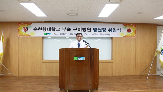 [구미=경북IT뉴스] 순천향대학교부속 구미병원은 10월 27일 향설교육관에서 제19대 병원장 취임식을 개최했다. 이번 취임식에는 황경호 의료원장을 비롯해 주요 내빈 및 교직원 약 100여명이 참석한 가운데 진행됐다.